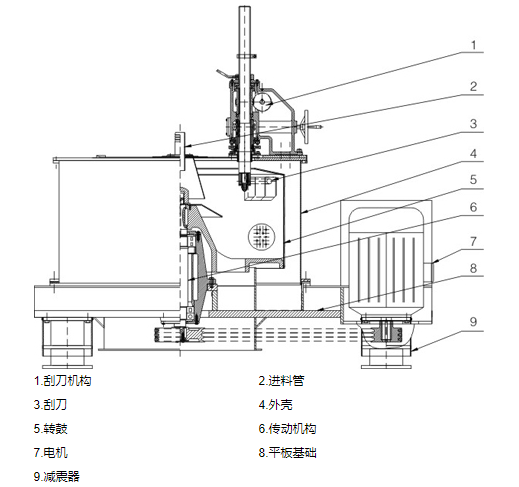 电动机带动转鼓中速旋转,进料阀开启将物料由进料管加入转鼓,进料达到预定容积后停止进料,转鼓升至高速旋转,在离心力作用下,液相穿过滤布和鼓壁滤孔排出。固相截留在转鼓内,转鼓降至低速后,刮刀旋转往复动作,将固相从鼓壁刮下由离心机下部排出。