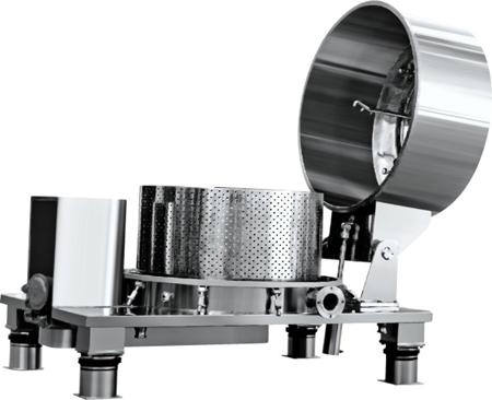 待分离的物料经进料管进入高速旋转的离心机转鼓内,在离心力场的作用下,物料通过滤布(滤网)过滤,液相经出液管排出,固相则截留在转鼓内。待转鼓内滤饼达到机器规定的装料量时,停止进料,对滤饼进行洗涤,同时将洗涤液滤出。滤饼脱液达到要求后,停机,滤饼同人工卸出。进入待机状态。