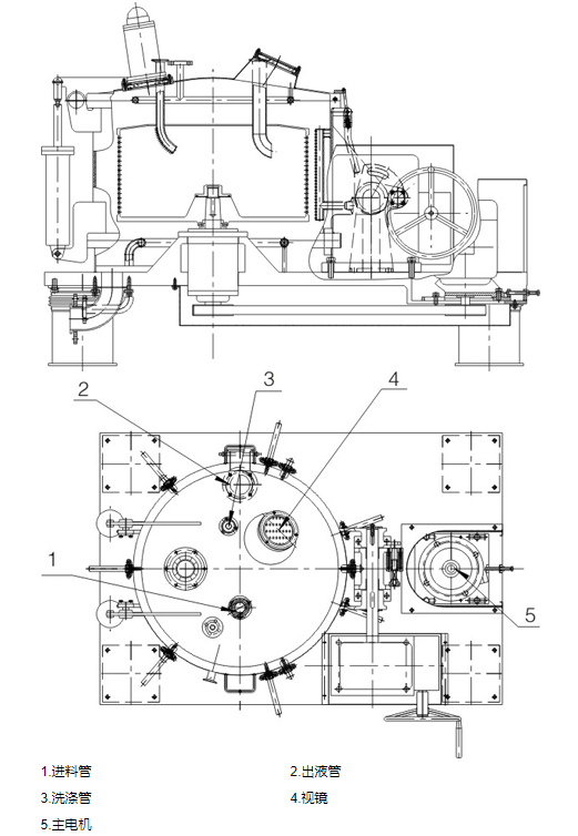 4、翻盖上设置进料管、洗涤管、观察镜、照明孔。配置在线清洗系统(选 装),对离心机外壳内壁、专鼓内外表面、集液槽表面等离心机内部进行在线清洗,保证了洁净度要求,符合GMP规范。